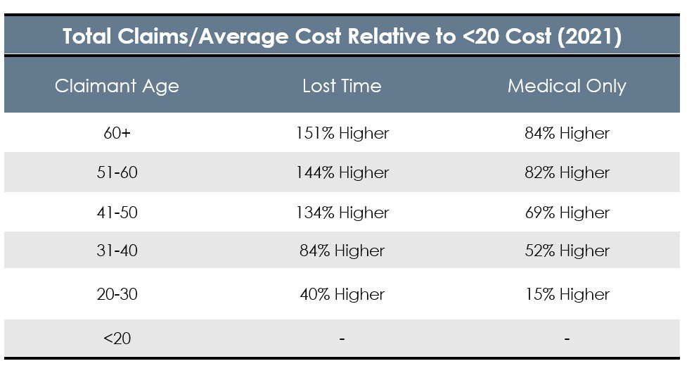 Compared to the average cost for claims for retail workers less than 20 years of age, the numbers for both lost time payments and medical only climb as the age of the worker climbs, reaching as high as 151% more costly for lost time claims.