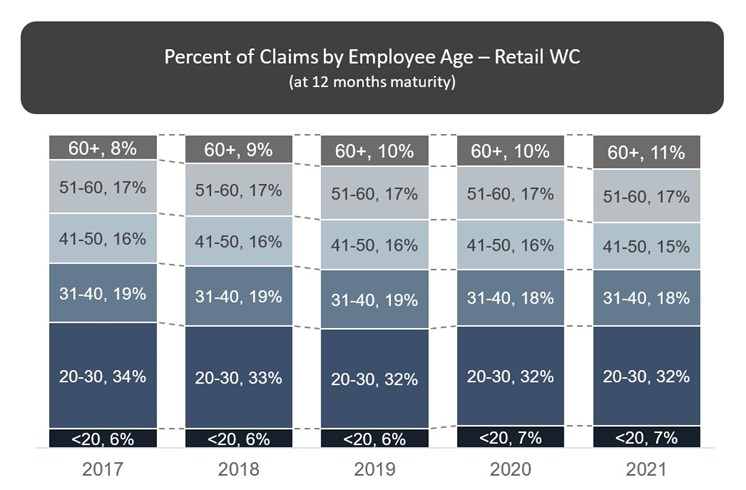 While over half of all retail workers are ages 16-34, according to the US Census bureau, the retail industry attracts a large percentage of the older population with ~23% being over the age of 55.3As aging populations continue to grow, so too will they grow in retail and in their impact on the workers' compensation costs.